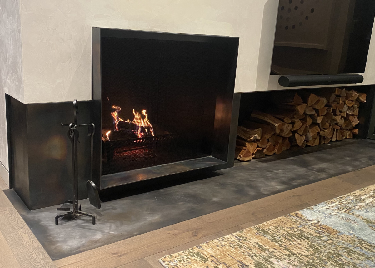 A client planned for a fire place that should structure a wall of a living room, in a contemporary style . The Chicago-based architect Thomas Shafer developed this black-oxidized steel sheet metal design. It features a fire place with metal surfaces that wrap around a corner to match other door elements, such as a sliding door design on the second wall. Structuring of the entire wall was one task, while providing simultaneously storage for fire wood. We used hot rolled 1/4" thick mild steel, sand blasted the mill-scale surface, plasma-cut the pieces for thermal oxidizing with a rose bud torch, to welded this complex 3-D structure.