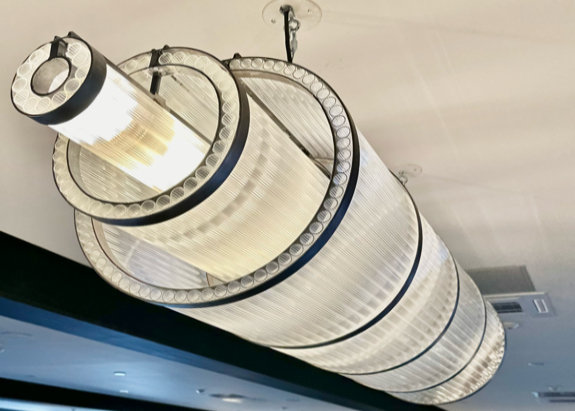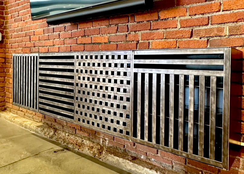 The design of the custom hardware matches the size of the tiles, so it could be set seamlessly in-between the tiles. Similarly the light fixtures and mirrors were set in-between the c-channels. Above the bathroom scaffold, an AC serves the entire loft space, and we created custom vent covers that match the c-channel structure of the bathroom scaffold underneath.