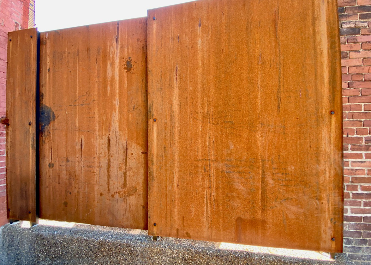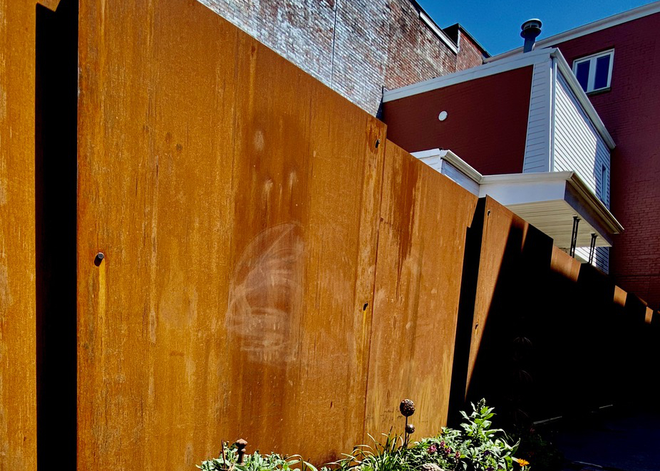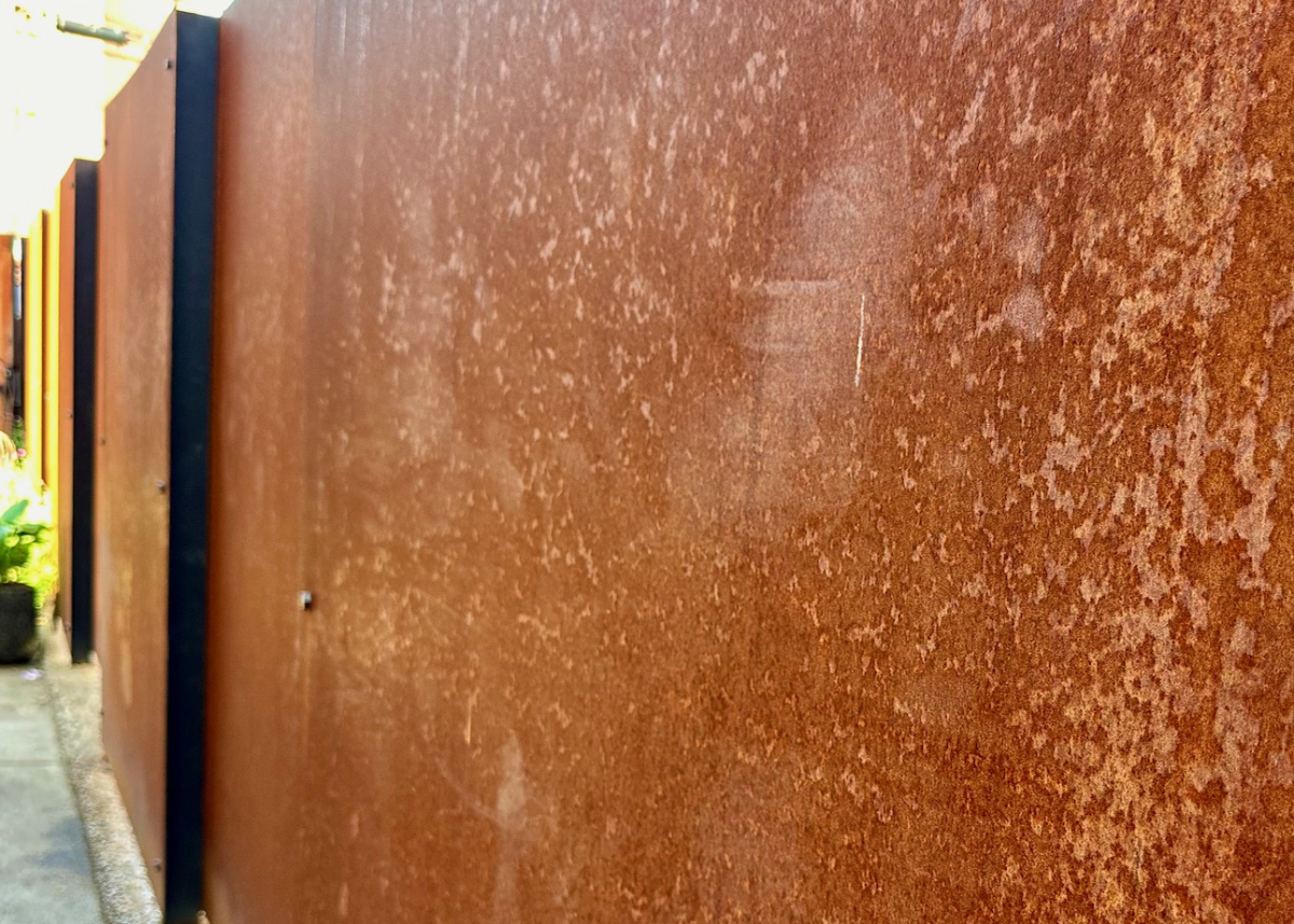 The clients wanted to use their courtyard more often, on a property that sits in a very densely build area. They asked asked for sight protection and requested a structure that has a contemporary modern appeal, more like an architectural sculpture than a fence. We build this sight protection out of Corten steel, that rusts naturally but then stops to protect the structure. We includes burglary resistant gates and doors. To grow plants on the otherwise brick plastered ground, we added matching planter boxes out of the same materials.