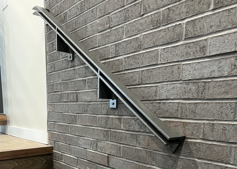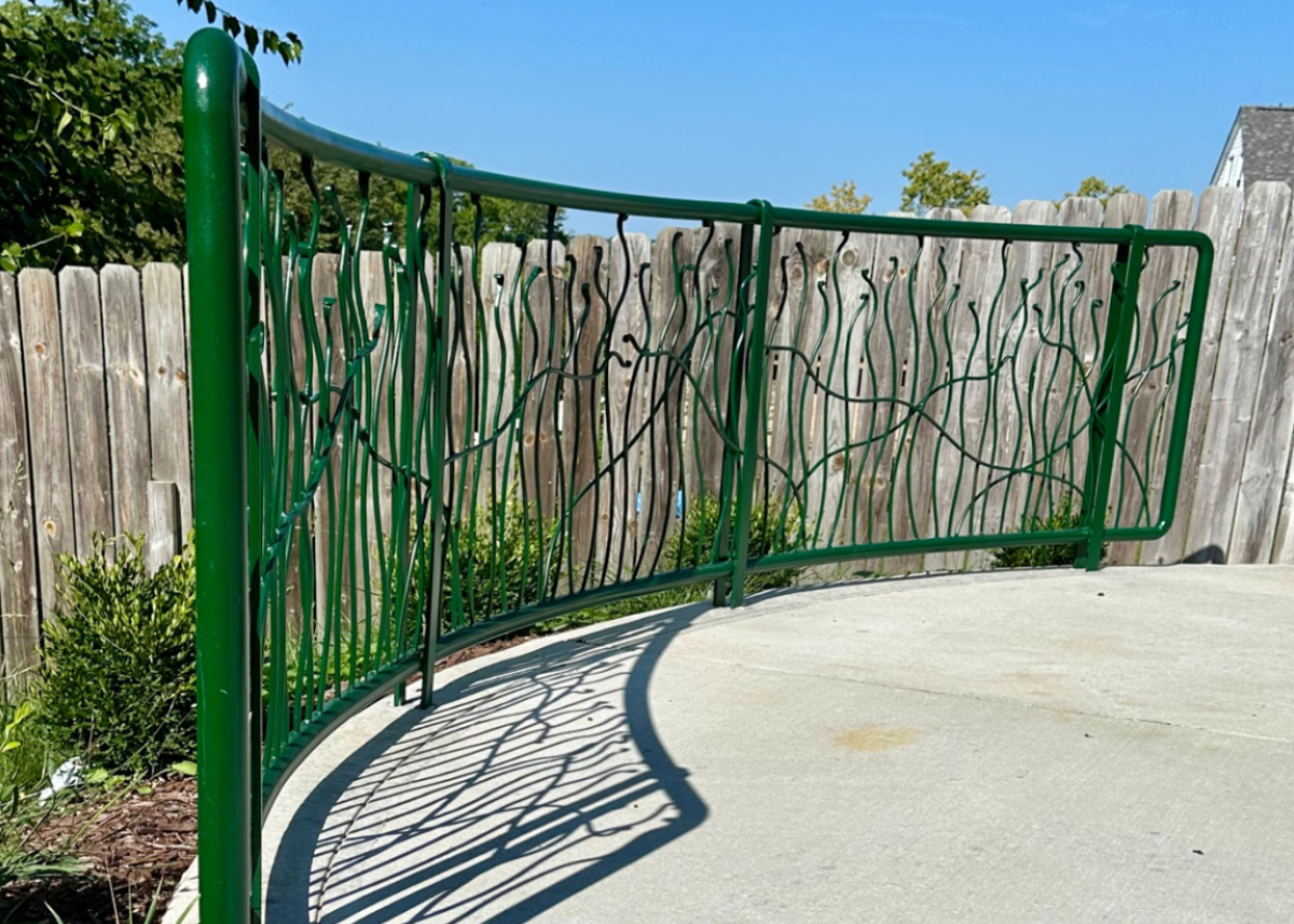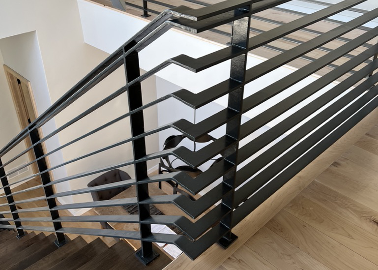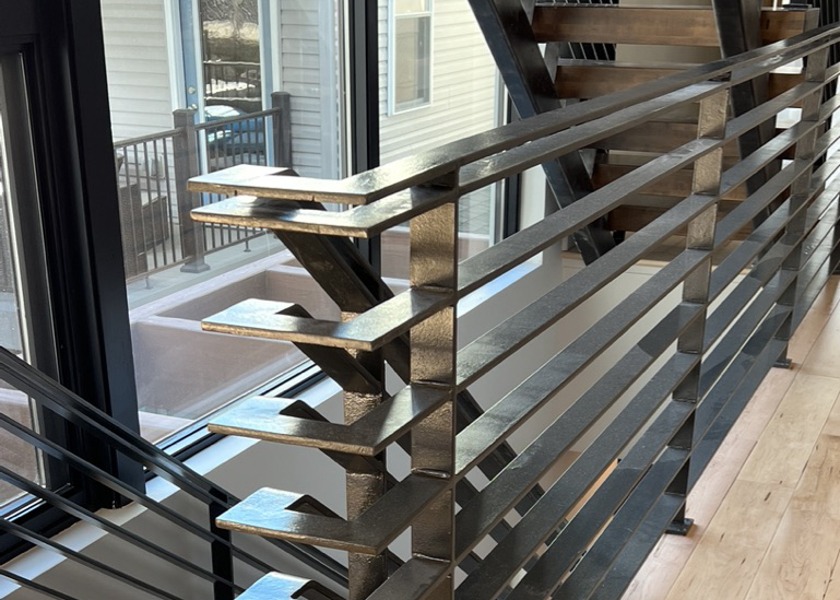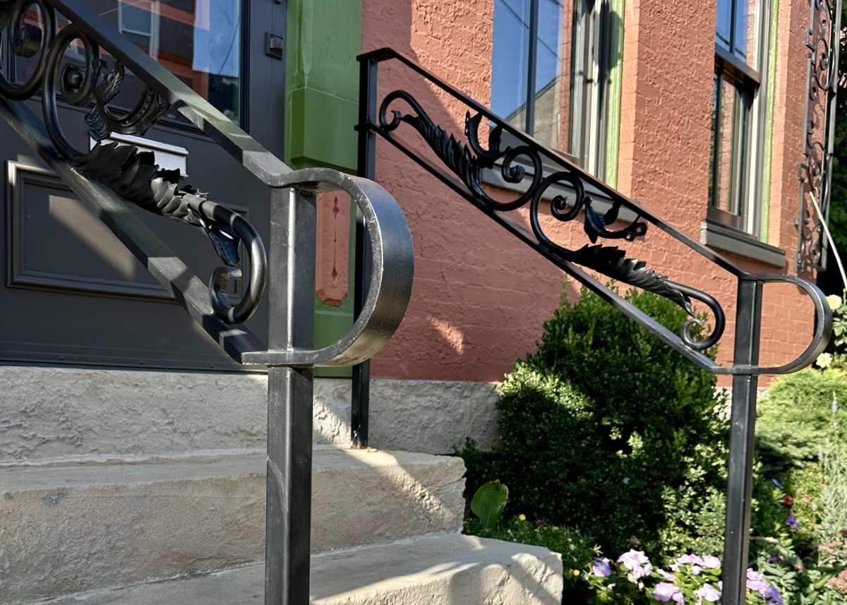 Our railing work includes welding and forging steel; we can incorporate wood, glass, and other materials. Photos show various examples.