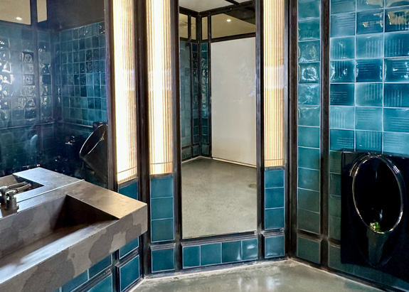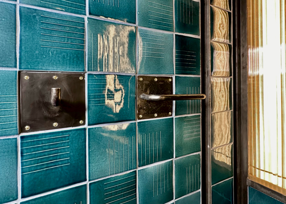 For the outer face, a feature wall was created, with ceramic tile panels in a design that we developed and crafted in our ceramic workshop. This outerwall design in charcoal is distinct but matches the inner panels of the bathroom, in teal.