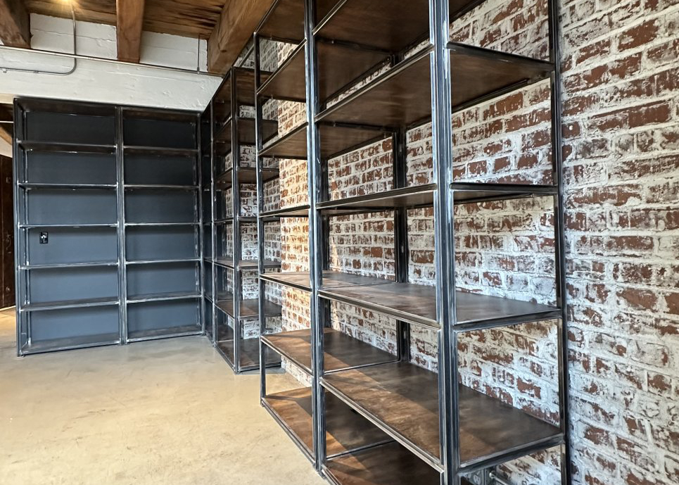 Our tasks included to provide maximum library wall space in front of walls that show chimneys and other irregularly protruding walls. We separated the shelving into individual but matching elements with various depth, so that the front of the shelving forms one line. As the clients liked a more intricate steel design, we worked with u-channel steel and cleared the "channel walls" between the touching channel elements to provide continuous lines along the horizontals and the verticals. The surface is wire-brushed and clear coated, with the original millscale visible.